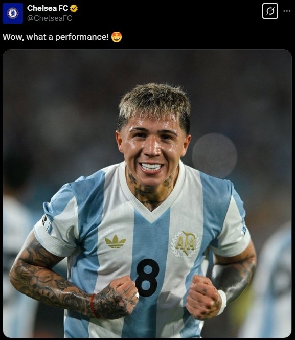 2025-03-26 22:27:37切尔西官推晒恩佐在阿根廷队的照片:哇哦,多么出色的表现!